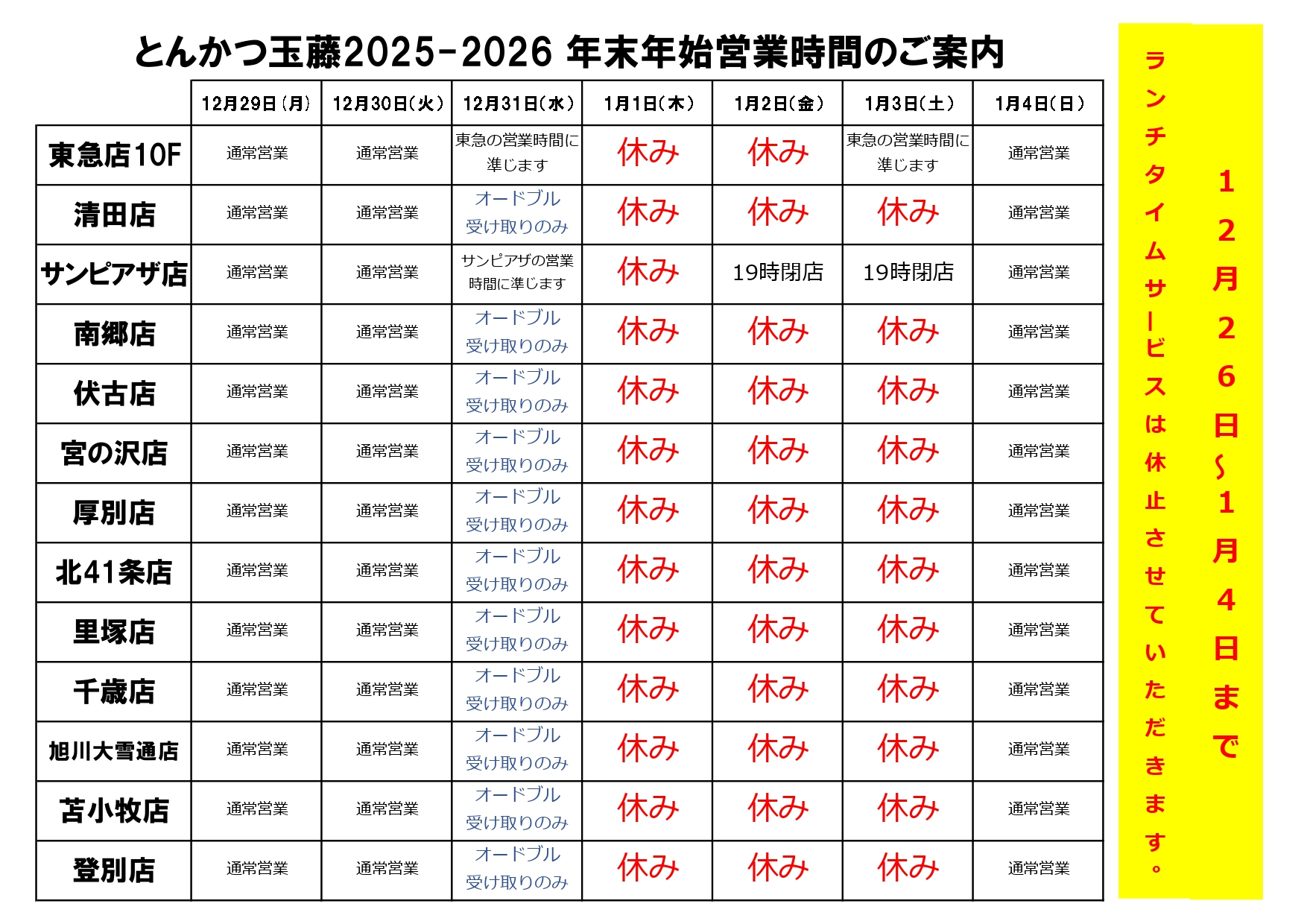 お知らせ 2025年11月26日 店舗情報 2025年 玉藤年末年始営業時間のお知らせ とんかつ玉藤 年末年始営業時間のお知らせ 2025年-2026年 とんかつ玉藤 年末年始営業時間のお知らせ 2025年-2026年 いつもとんかつ玉藤をご利用頂きまして誠にありがとうございます。年末年始の営業時間のお知らせでございます。皆様のお越しをお待ち申し上げております。