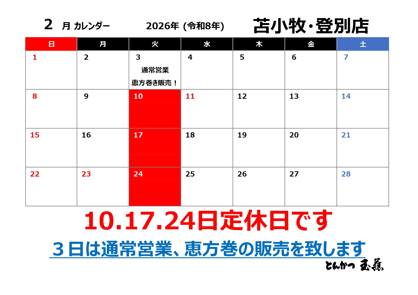 苫小牧店 ・ 登別店 【2026年 2月】定休日のお知らせ
