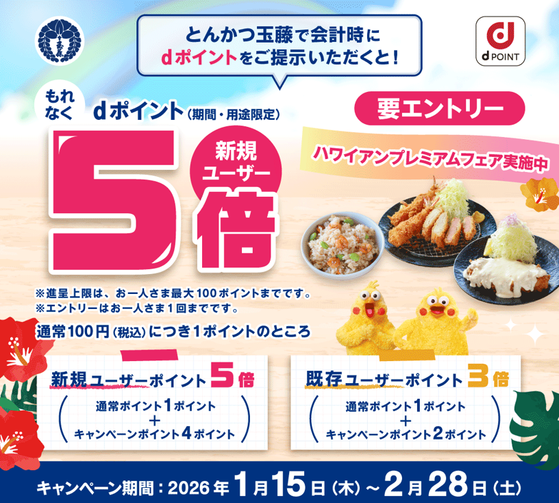さらにさらに!dポイントカードを玉藤で初めて利用の方はポイント5倍!